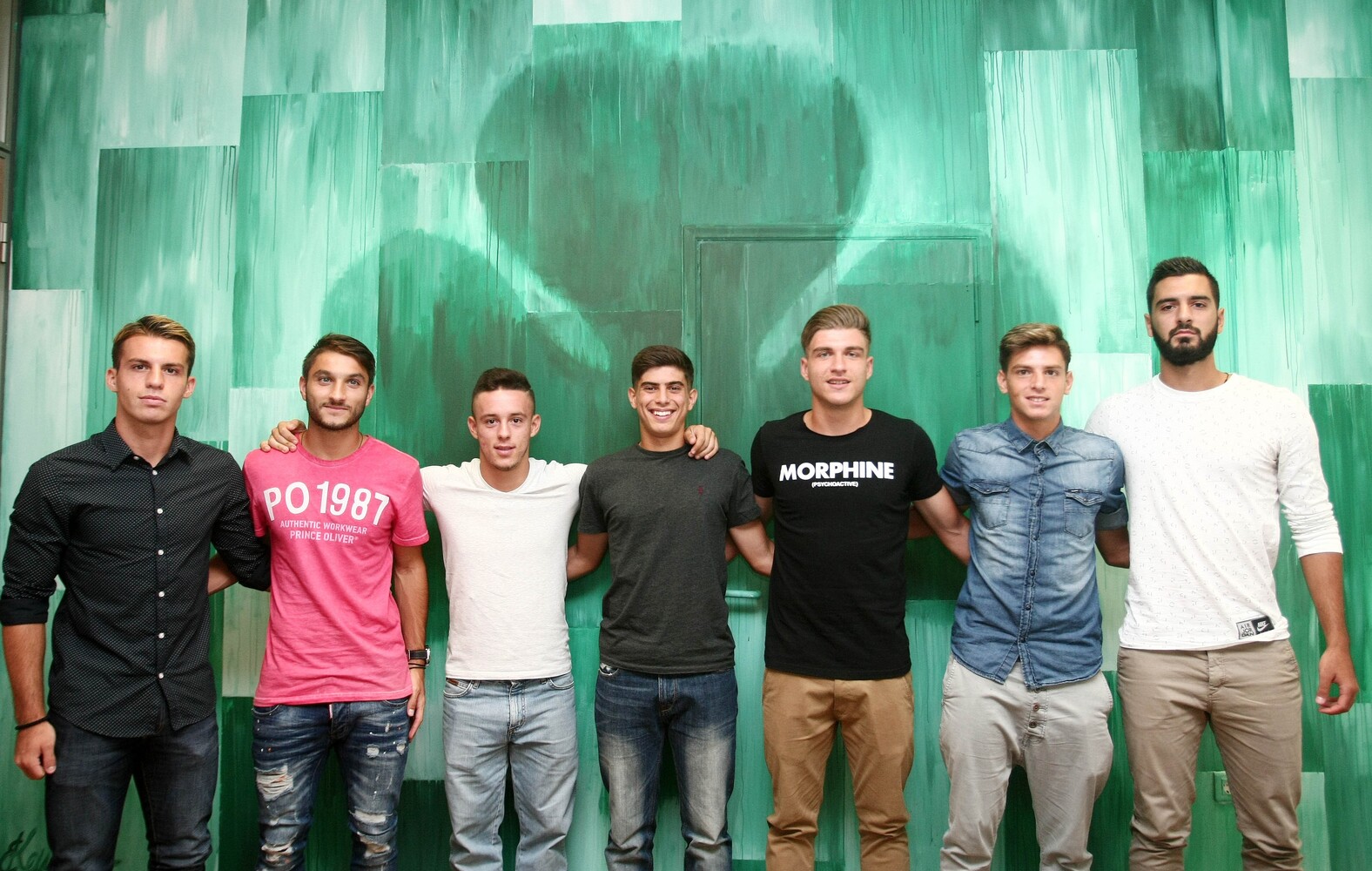 Αύγουστος 2016: Ο Τάσος Χατζηγιοβάνης (δεύτερος από δεξιά) μαζί με τους συμπαίκτες του στην Κ20 του Παναθηναϊκού (Σερβιλάκης, Ξηρός, Παπανικολάου, Μπουζούκης, Μίγγος, Τριανταφυλλόπουλος) κατά την υπογραφή των επαγγελματικών συμβολαίων τους / Photo by: ΙΝΤΙΜΕ.